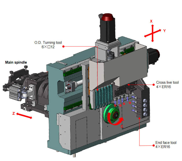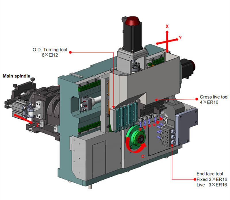●New upgrade EN series single spindle, higher rigidity! More stability! ●It is easy to switch between two processing modes: guide bush mode and no guide bush mode. ●Modular design, can be loaded with a variety of tools. ●Maximum processing diameter 20mm/26mm ●The spindle adopts high-speed motorized spindle, whose electromagnetic energy is directly converted into mechanical energy without transmitting power loss, and realizes the high speed of the spindle, and the power curve at both ends realizes low speed and high torque output. ●Adopt new heat source cooling scheme, centralize cooling of motorized spindle and power head, and use heat exchanger to reduce temperature rise of electric cabinet.