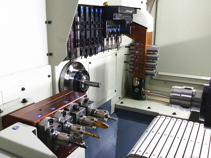 ●全新升級(jí)E系列雙主軸走心機(jī),更高剛性!更高穩(wěn)定性! ●兼并走心和走刀(有導(dǎo)套模式和無導(dǎo)套模式)兩種加工模式,切換簡(jiǎn)便。 ●模塊化設(shè)計(jì),可裝載刀具種類豐富。 ●最大加工直徑20mm/26mm(20型最大20mm,25型最大26mm) ●主軸采用高速電主軸,其電磁能直接轉(zhuǎn)化為機(jī)械能,無轉(zhuǎn)遞功率損耗,并且實(shí)現(xiàn)了主軸的高轉(zhuǎn)速,兩端功率曲線實(shí)現(xiàn)了低速高扭矩輸出。 ●采用全新熱源冷卻方案,對(duì)電主軸和動(dòng)力頭采用集中冷卻,電柜使用熱交換器降低溫升。 ●全新設(shè)計(jì)刀架結(jié)構(gòu),增強(qiáng)了整體結(jié)構(gòu),使切削剛性進(jìn)一步增強(qiáng)。